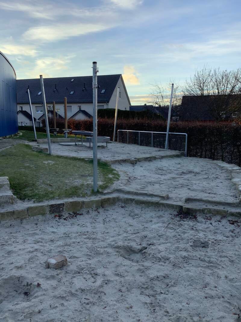 • Sandspielbereich mit Matschanlage, getrennt durch Sandsteinmauern, Schaukel, Seilgarten, Kinderwald